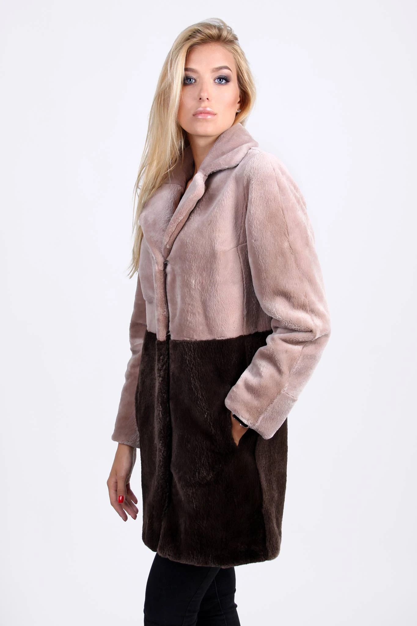 Béžovo hnedý dámsky kožuch z kožušiny strihaného bobra.