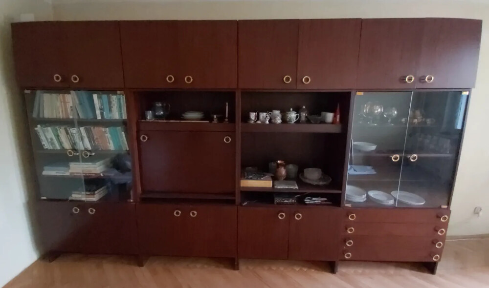 Darujem za odvoz obývaciu stenu alebo len jednotlivé skrine a nadstavce. Celková šírka obývacej steny je 360 cm, celková výška 215 cm, hĺbka 48 cm. Spodné skrine majú šírku 90 cm, výšku 165 cm, hĺbku 48 cm. Oddeliteľné nádstavce majú šírku 90 cm, výšku 50 cm, hĺbku 48 cm. Obývacia stena je nepoškodená vo výbornom stave.