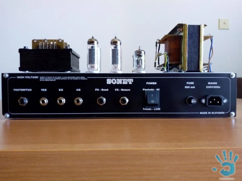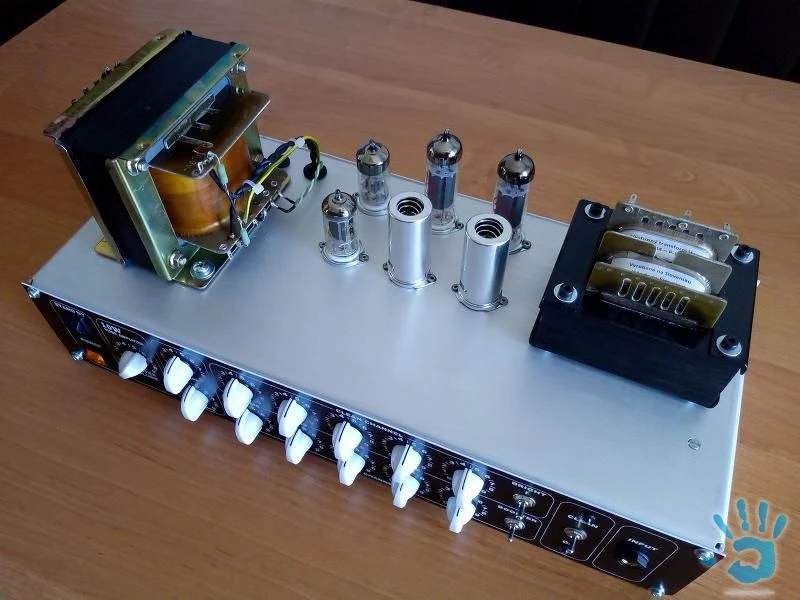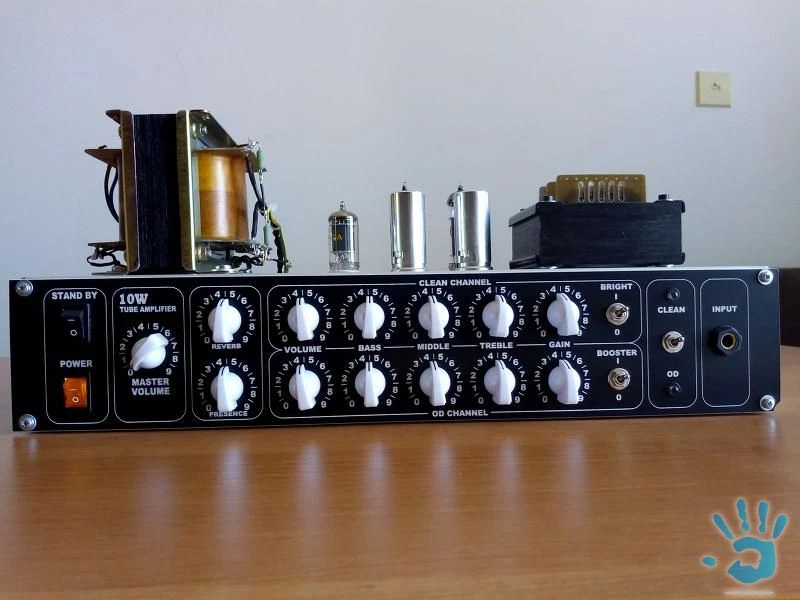 Predam home made elektronkovy zosilnovac na gitaru bez skrinky. Vykon 10W, dva nezavisle kanaly, Clean/Overdrive/Reverb/Presence. Korekcie 2x - Bass, Middle, Treble, Volume, Gain, 1x Master volume. Reverb elektronicky PT2399. Clean kanal ma prepinac Normal/Bright, OD kanal ma prepinac Normal/Boost. Prepinanie Clean/OD na prednom panele + prepojenie na footswitch na zadnom panele. Vystup pre reproduktor 4, 8, 16 ohm. Prepinanie vykonu Vysoky/Nizky. Rozmery: 420x 200 mm, vyska 185 mm. PREDANE