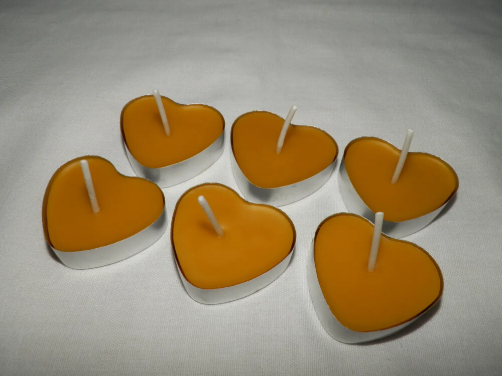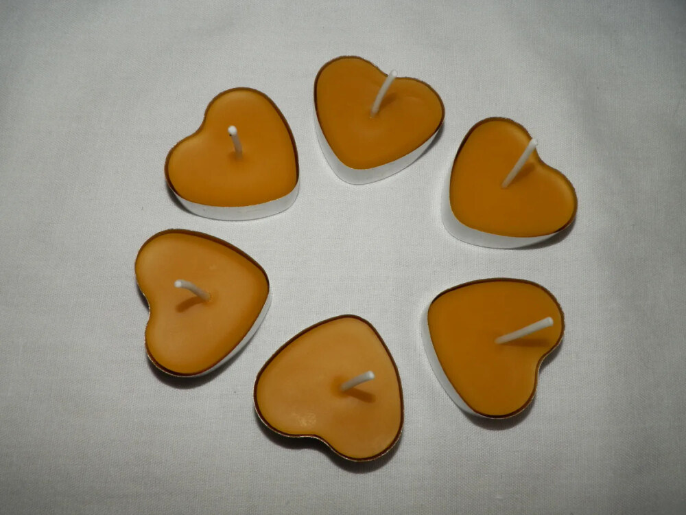 Predám voskové čajové sviečky v tvare srdca - sada 6 ks zo 100% prírodného vosku, vlastnej výroby. Sviečky sú ručne vyrobené rokmi overenou receptúrou a technológiou priamo včelárom. Sviečky obsahujú iba čisto prírodný vosk vyprodukovaný vlastnými včelami. Sviečky neobsahujú žiadnu prímes farbiva alebo inej chemikálii iba čisto 100% prírodný vosk vyprodukovaný včelou.